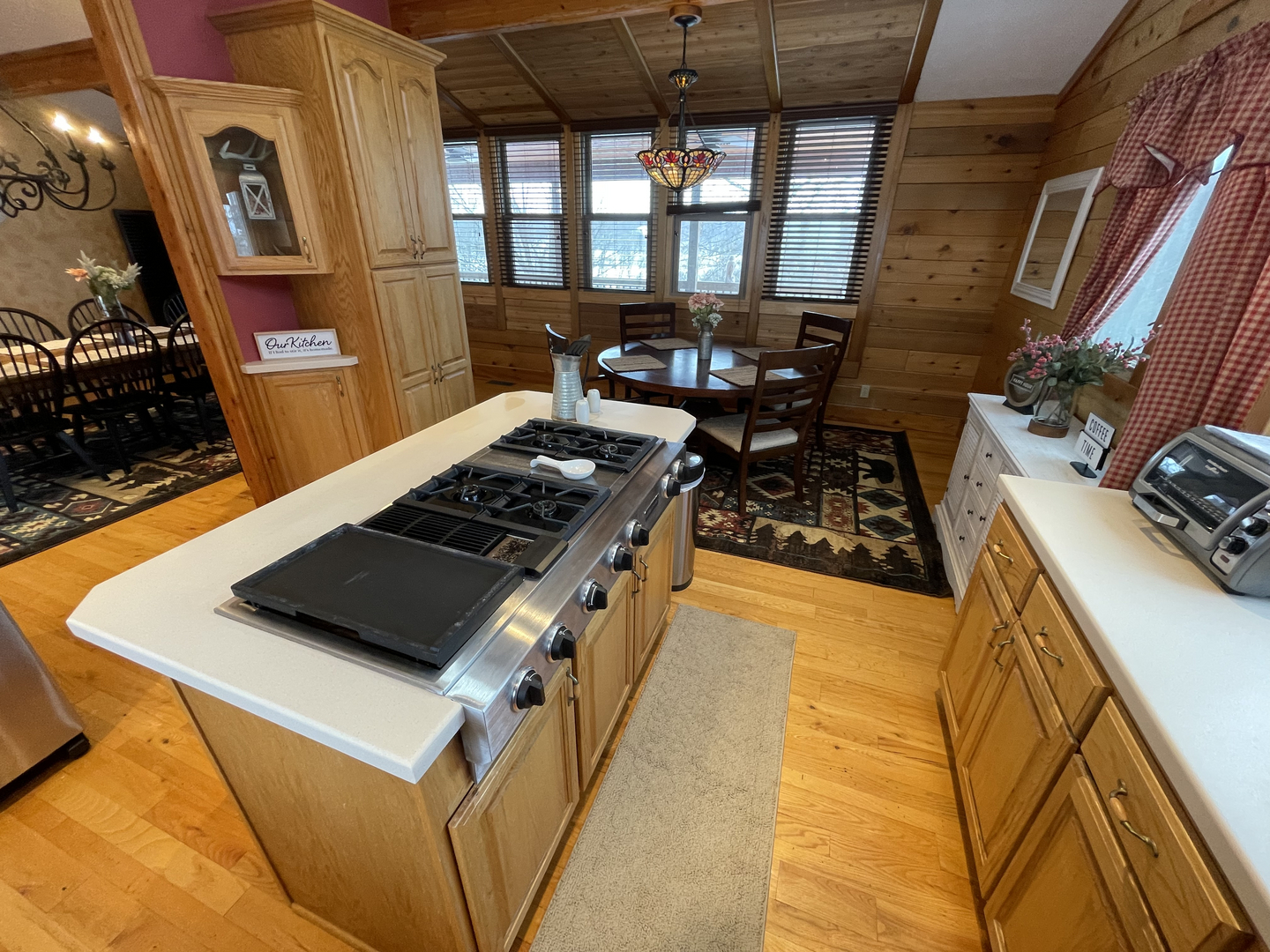 Our Lodge is ideal for family & friends wanting to enjoy the simple pleasures of nature, relax and enjoy in a rustic luxury cabin conveniently located to many exciting opportunities and outdoor adventures. Our lodge is comfortably furnished. There is a fully equipped gourmet kitchen, a dining area, dishes, pots & pans, utensils, microwave, dishwasher, 4 bedrooms, 3 1/2 bathrooms WIFI, satelite TV, DVD, air conditioning, washer and dryer, linens and bath towels. There is an outside deck, gas grill (propane included).